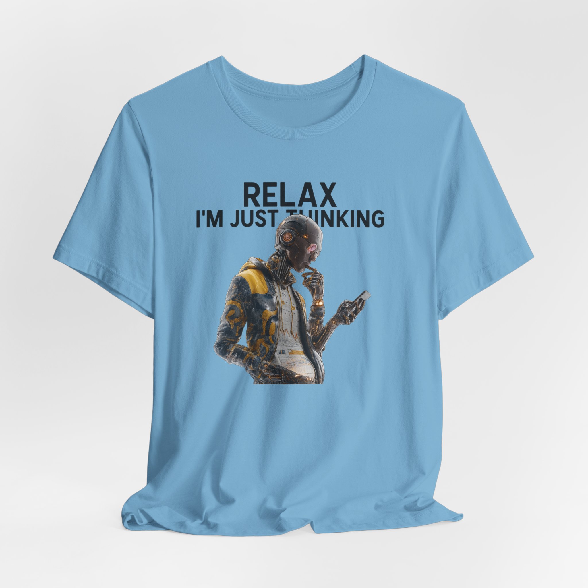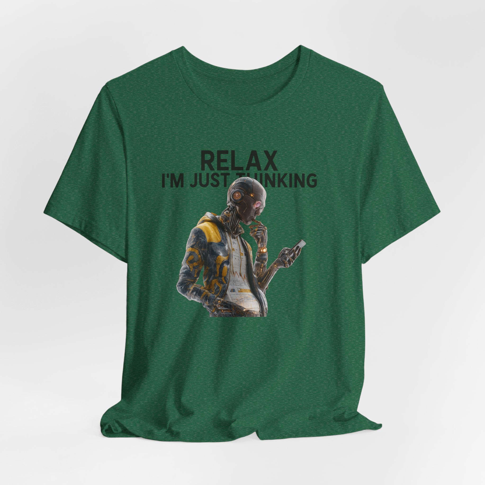 A unisex jersey short sleeve tee featuring a humanoid AI robot holding a smartphone in one hand, finger on chin with another hand, and third hand in his pocket, with the text ‘I Think Therefore I Am’. This tee gives off a modern and tech-savvy vibe, perfect for those interested in AI and technology. Ideal for casual wear or for tech enthusiasts and philosophers. Relevant for tech events, computer science celebrations, and casual outings.