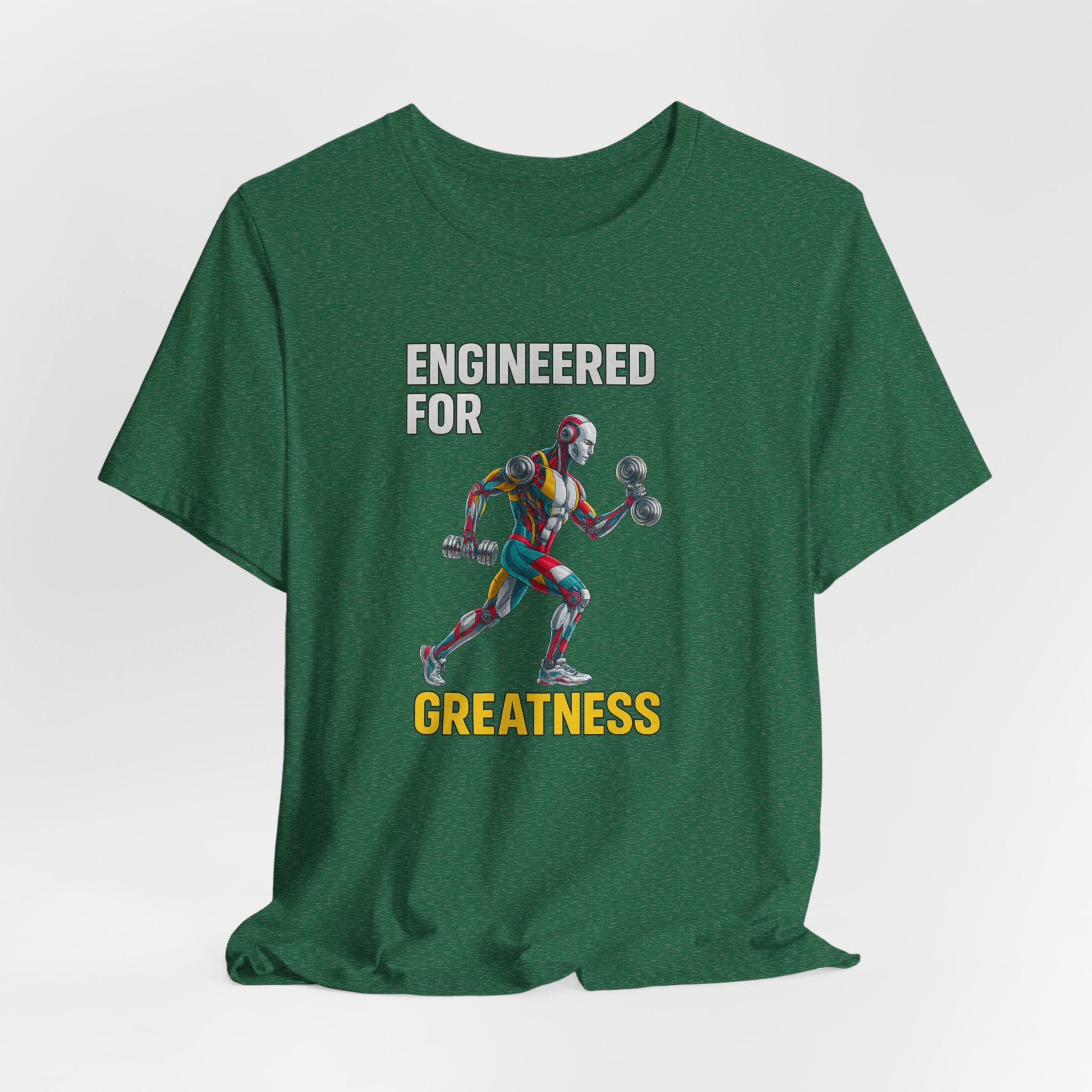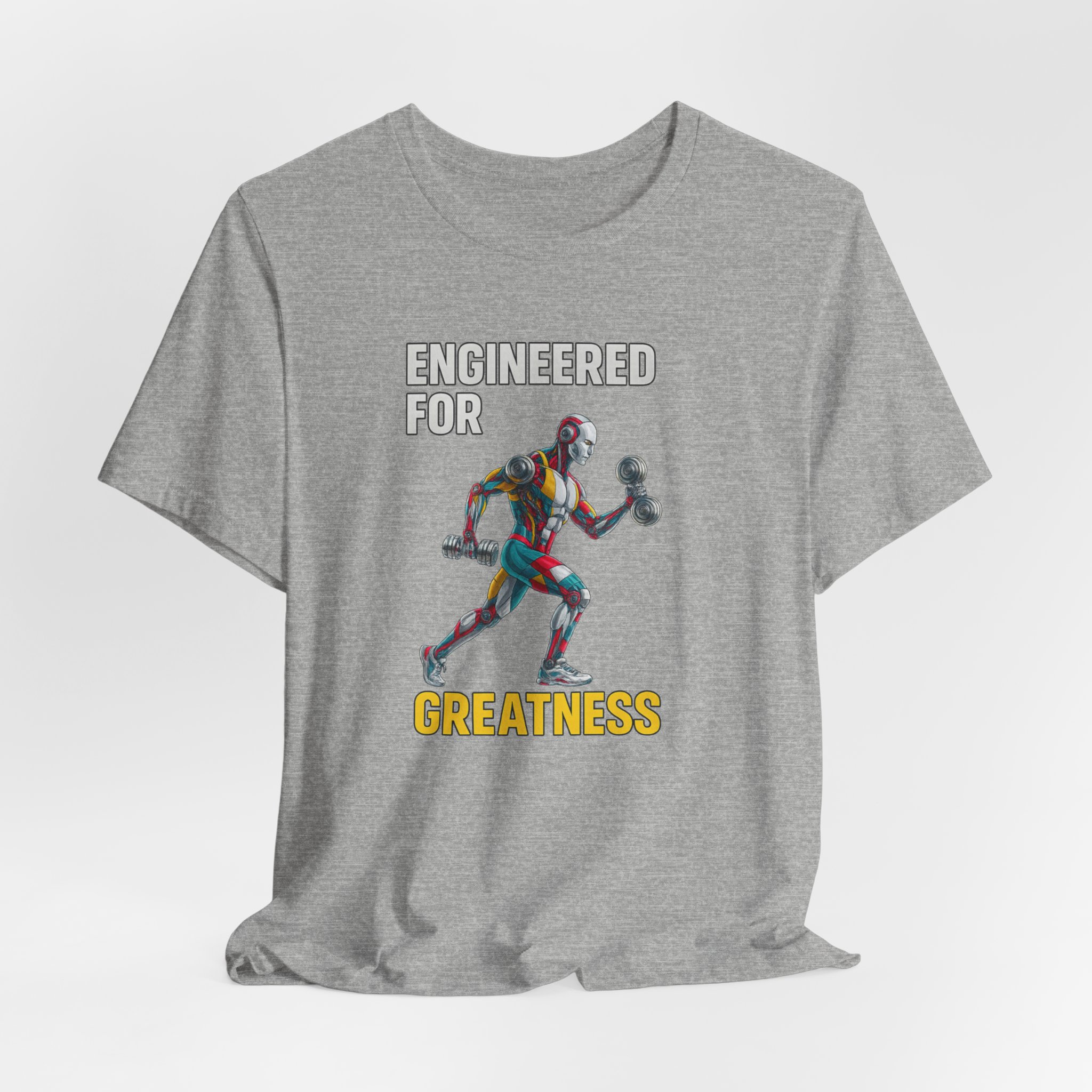 This futuristic AI robot themed T-Shirt features a sleek athletic robot working out, with the text ‘Engineered for Greatness’. It gives off a futuristic and energetic vibe, perfect for fitness enthusiasts and tech lovers. Ideal for casual wear or to make a statement at the gym. Great for gifting on birthdays or special occasions.
