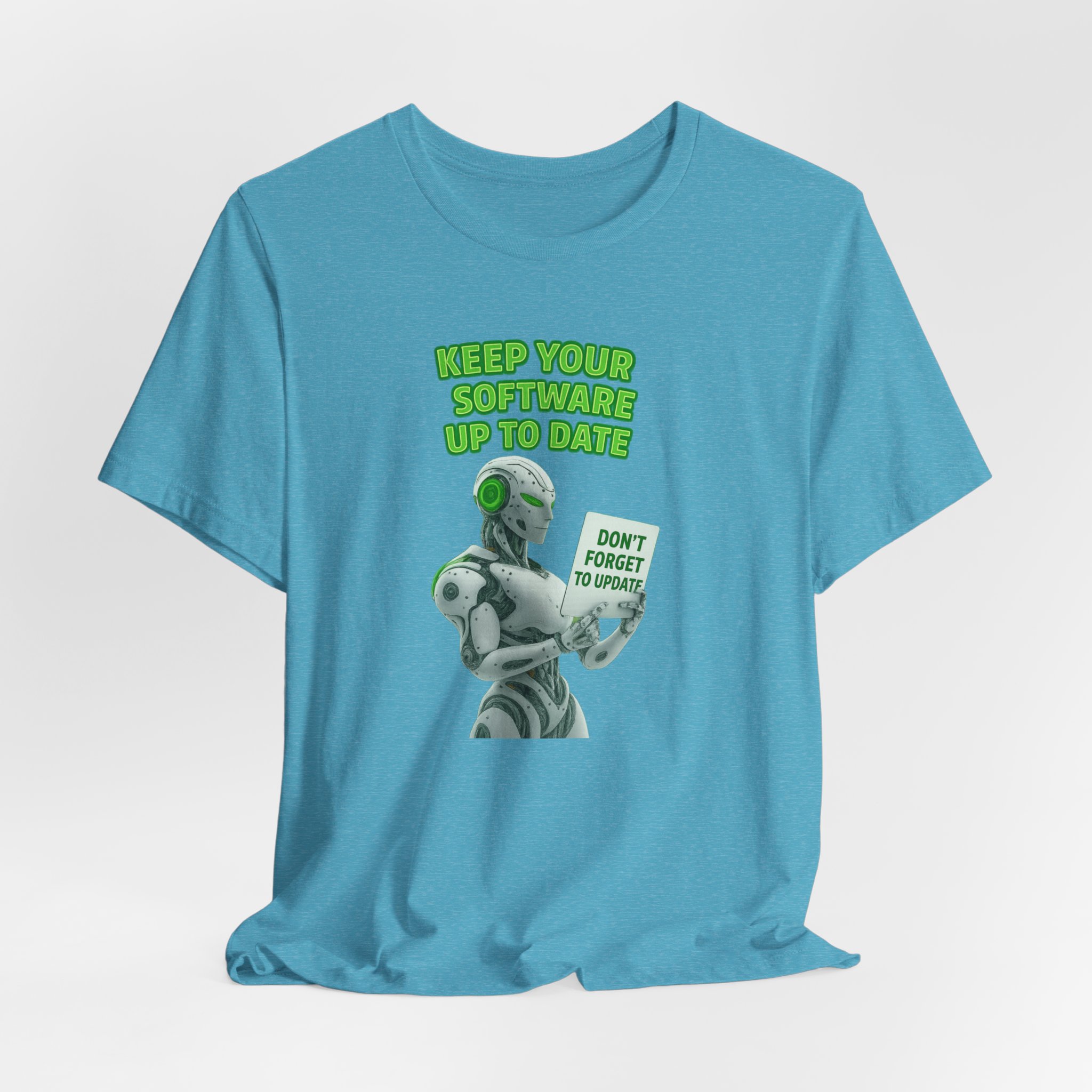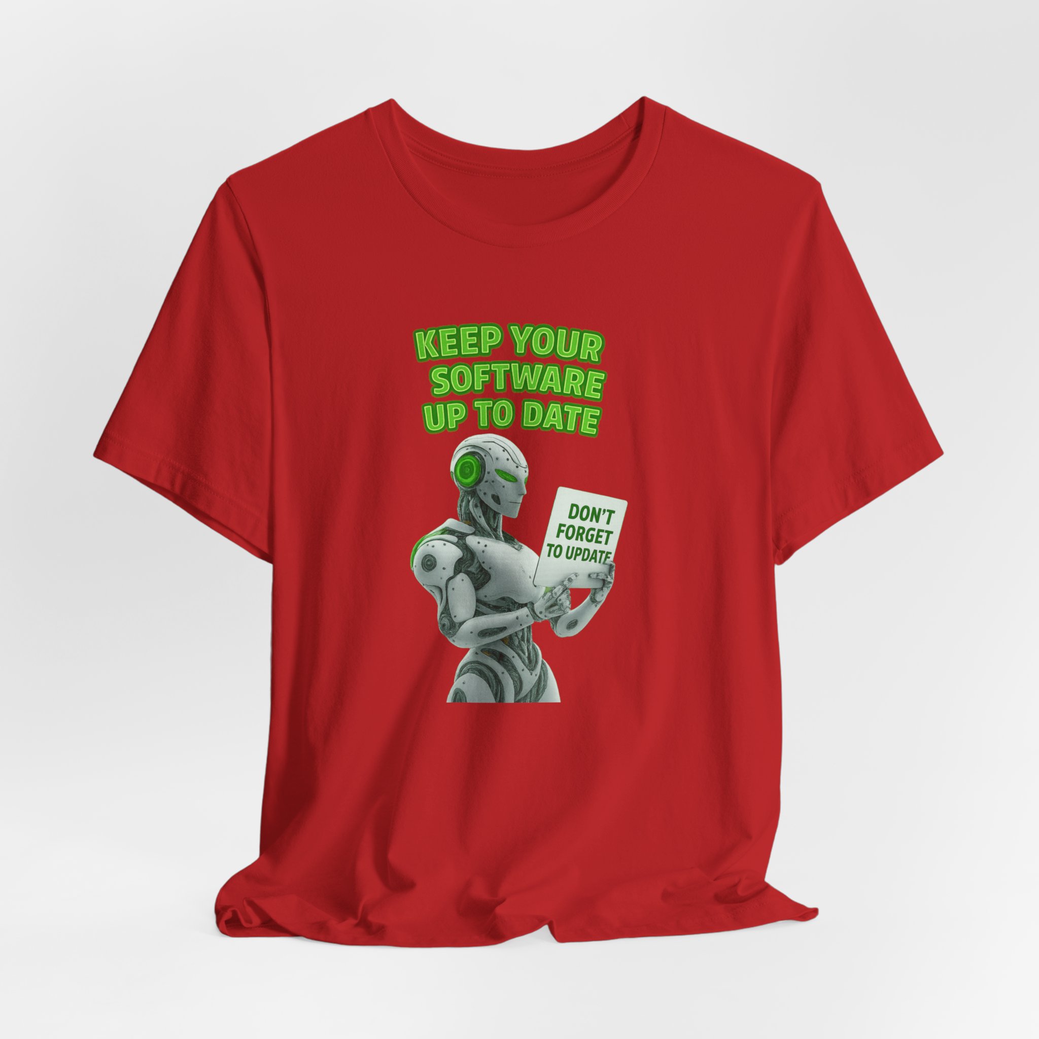 A cool and futuristic T-Shirt featuring an AI robot holding a sign that says ‘Don’t forget to Update’. Perfect for tech lovers and those who appreciate quirky designs. Ideal for casual wear or as a statement piece. Relevant for tech-themed events, IT professionals, and computer enthusiasts.