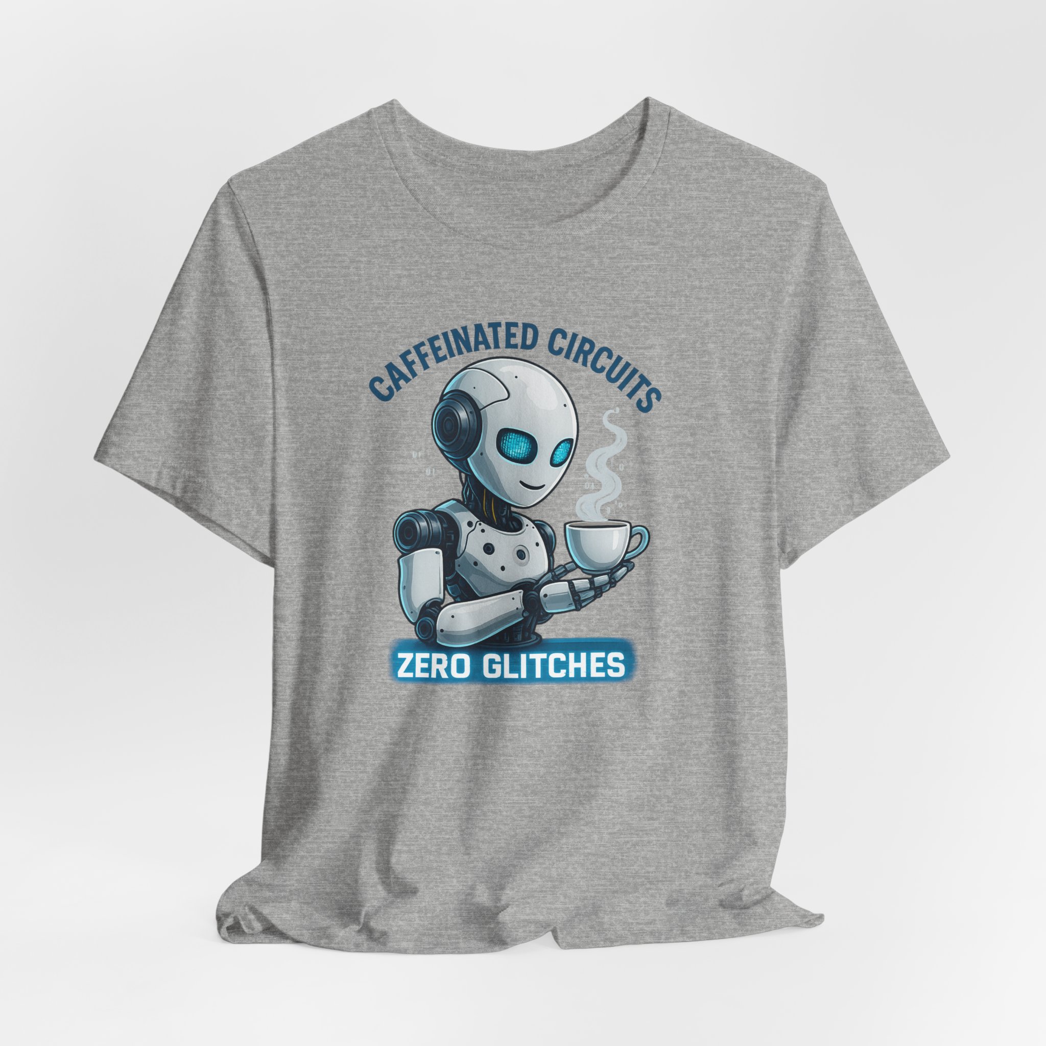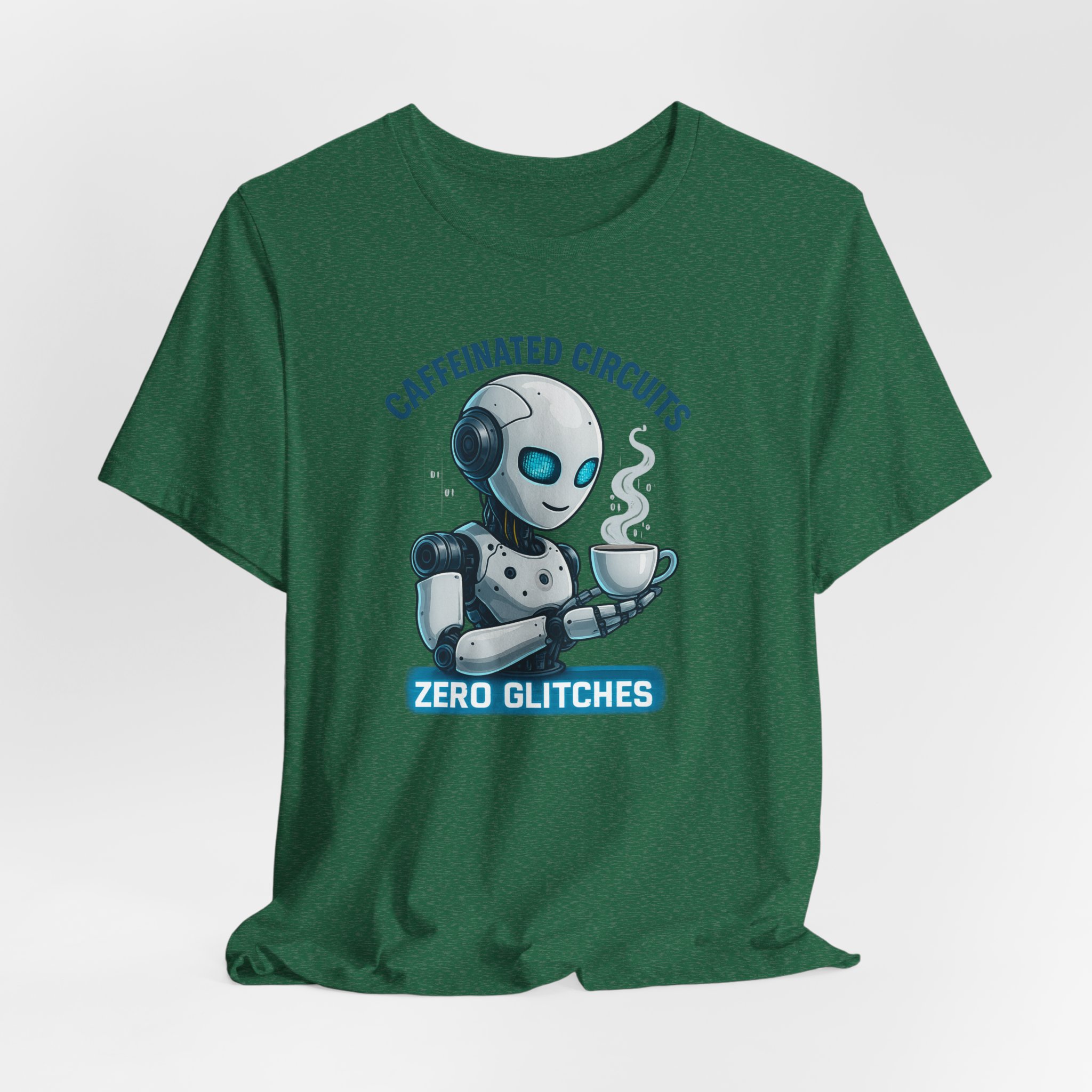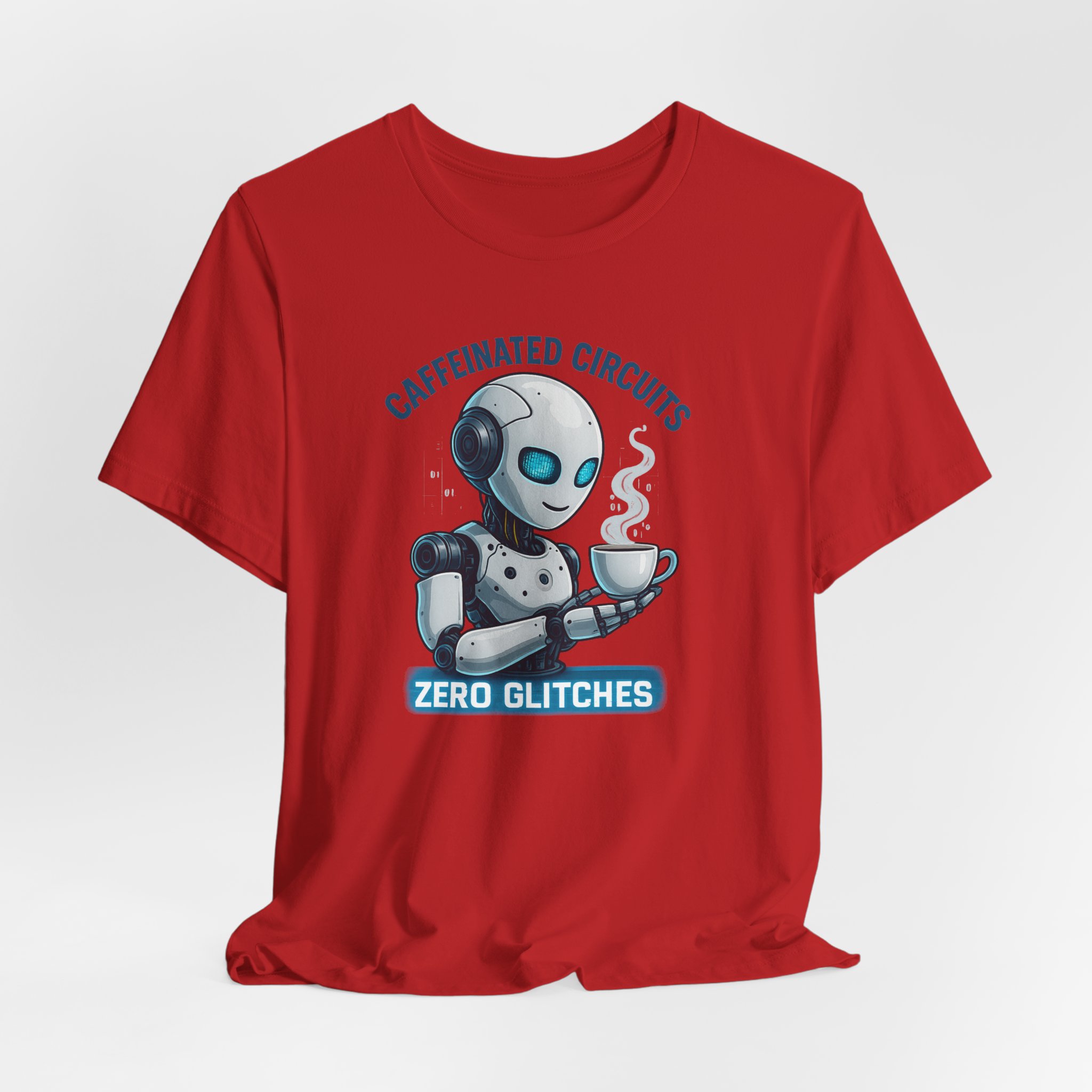 A futuristic AI robot holding a cup of coffee with the text ‘Caffeinated Circuits, Zero Glitches’. This T-Shirt gives a techy and caffeinated vibe, perfect for computer geeks and coffee lovers. Ideal for casual wear, it can be worn by adults during tech events or coffee meetups.