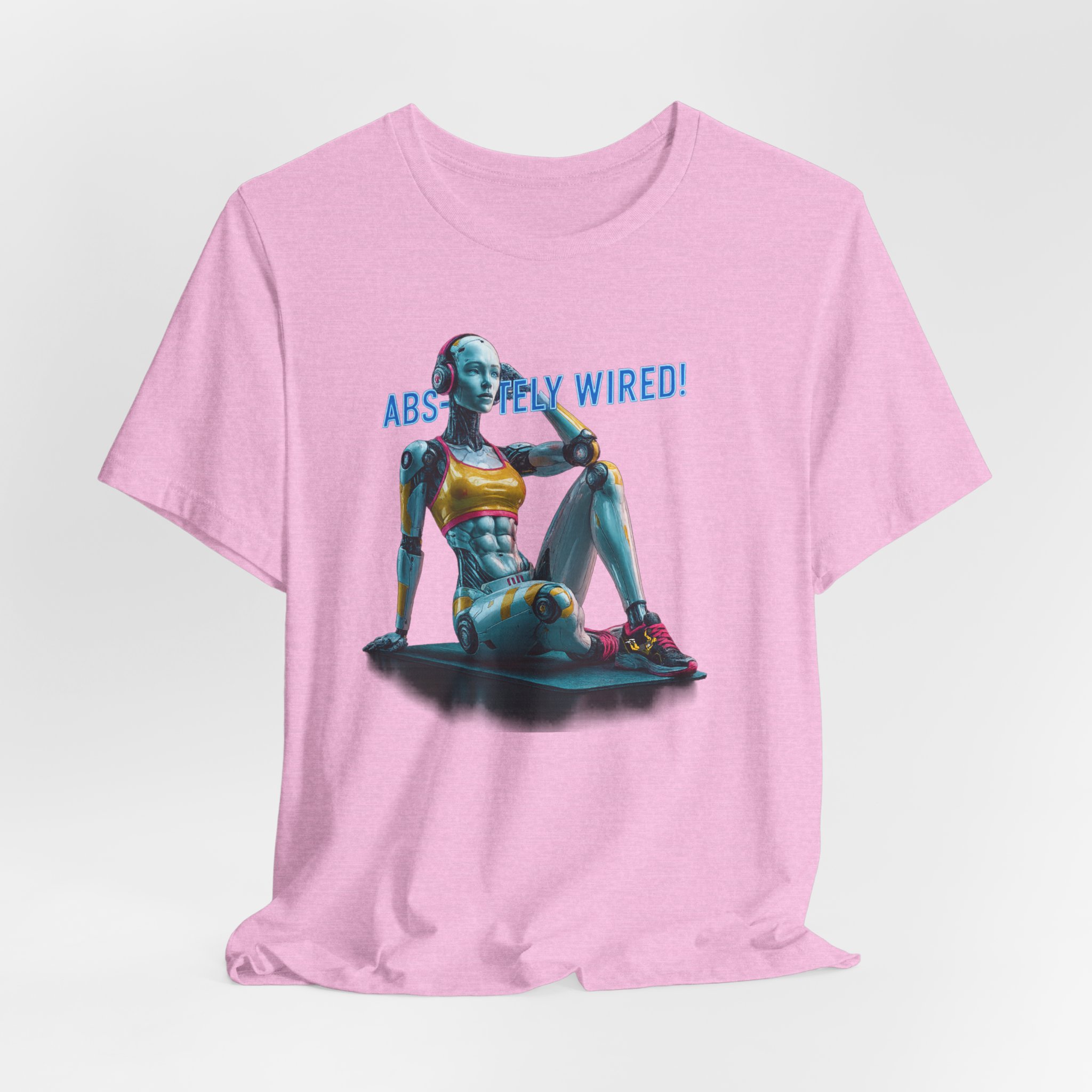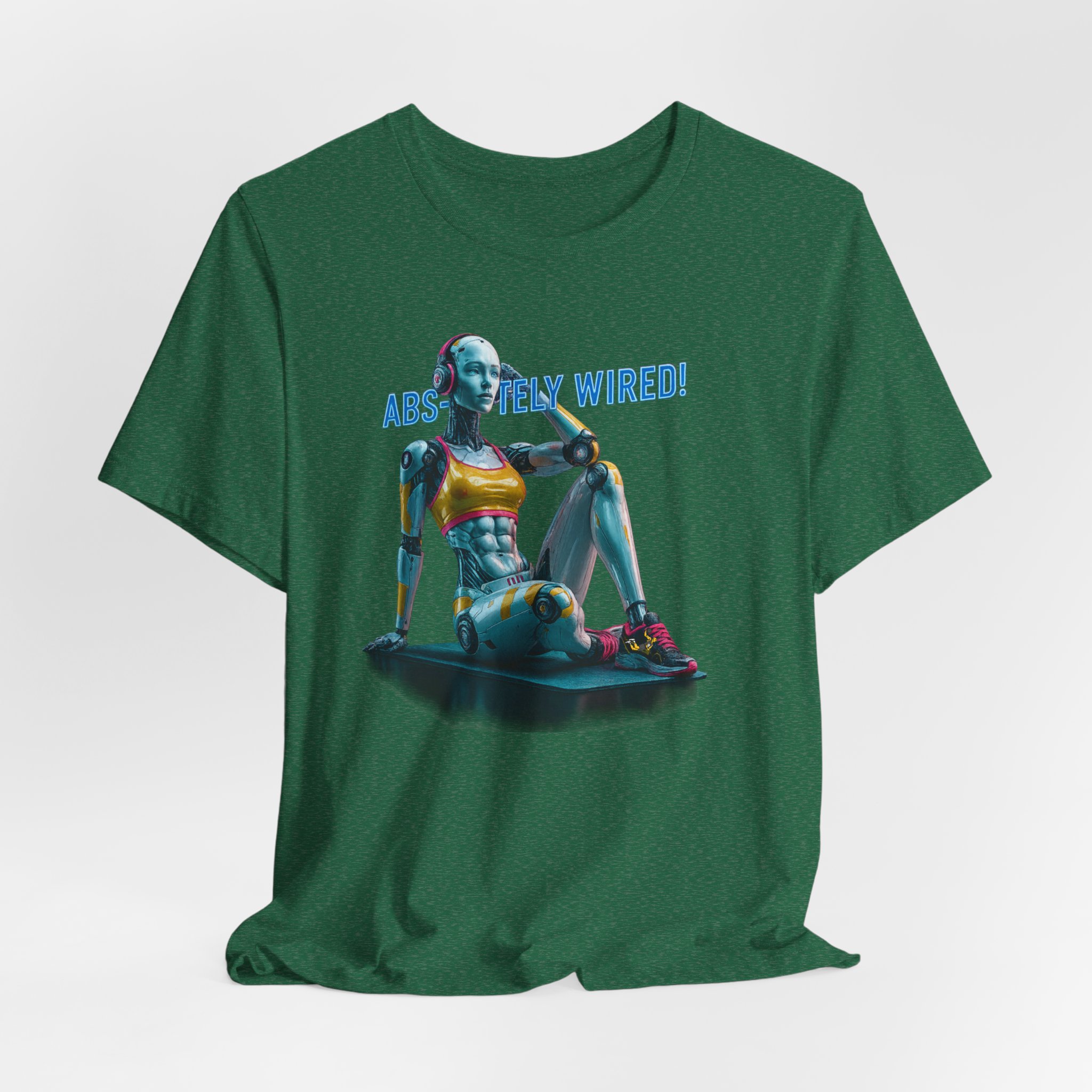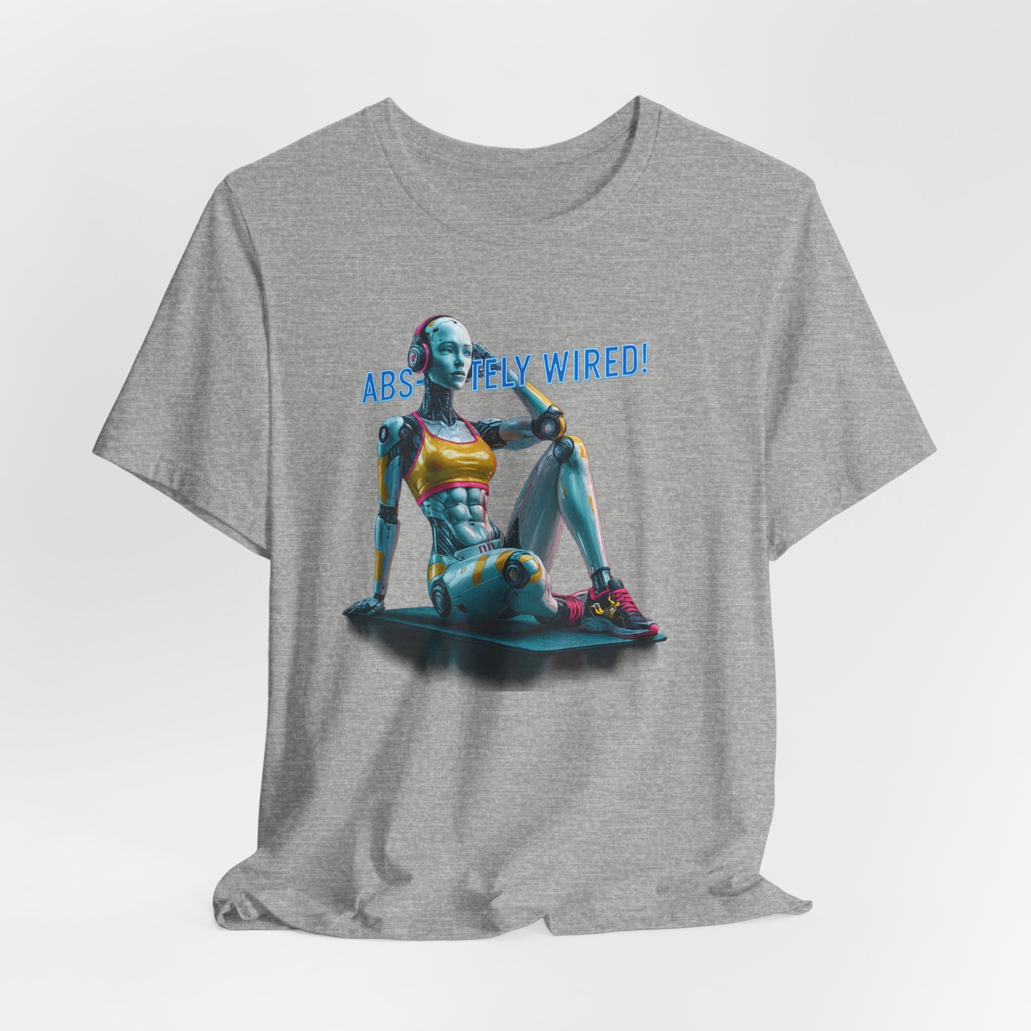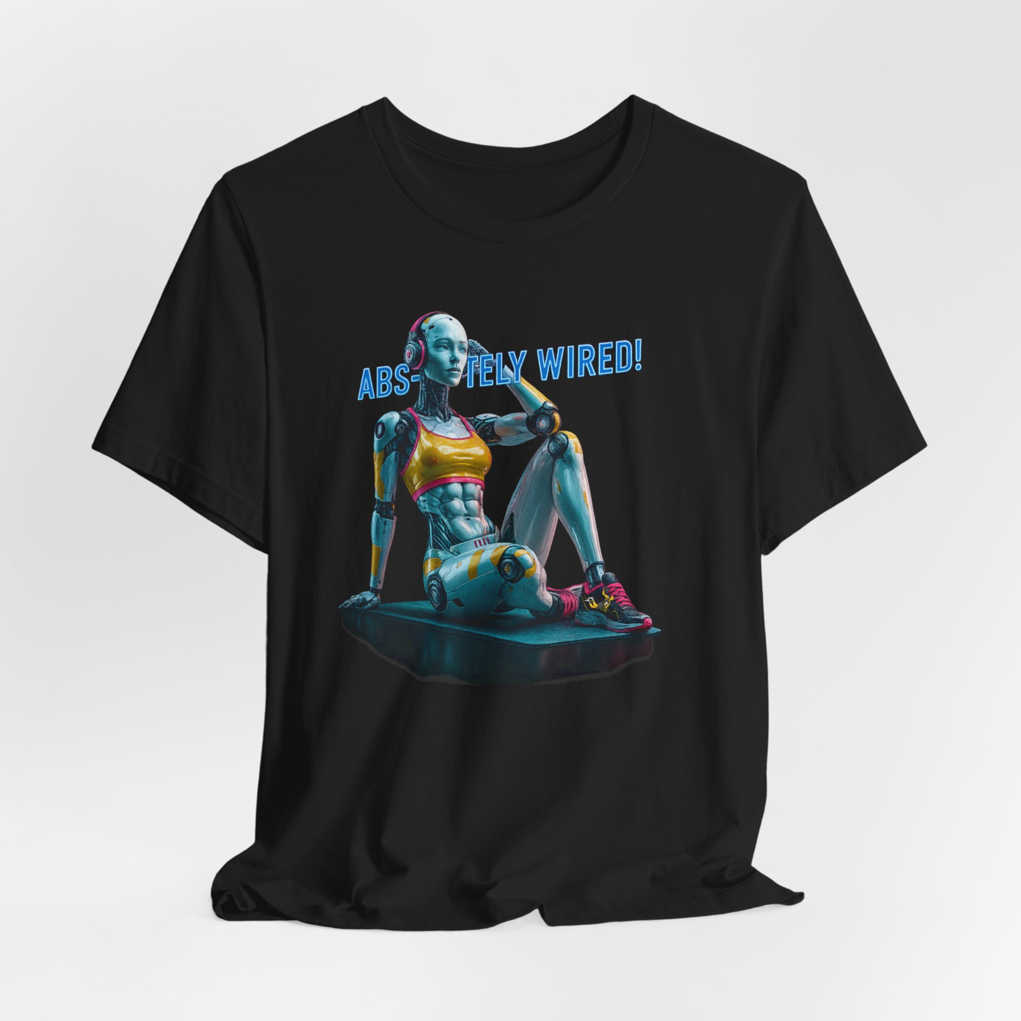 A futuristic T-Shirt featuring a female humanoid AI robot after performing sit-ups, with the text ‘Absolutely Wired’. This shirt exudes a modern and edgy vibe, perfect for tech enthusiasts and fans of AI. Ideal for casual wear and can be a unique conversation starter at social gatherings and tech events, as well as a great gift for tech-savvy friends and family members. Relevant to occasions like birthdays, tech conferences, and casual outings.