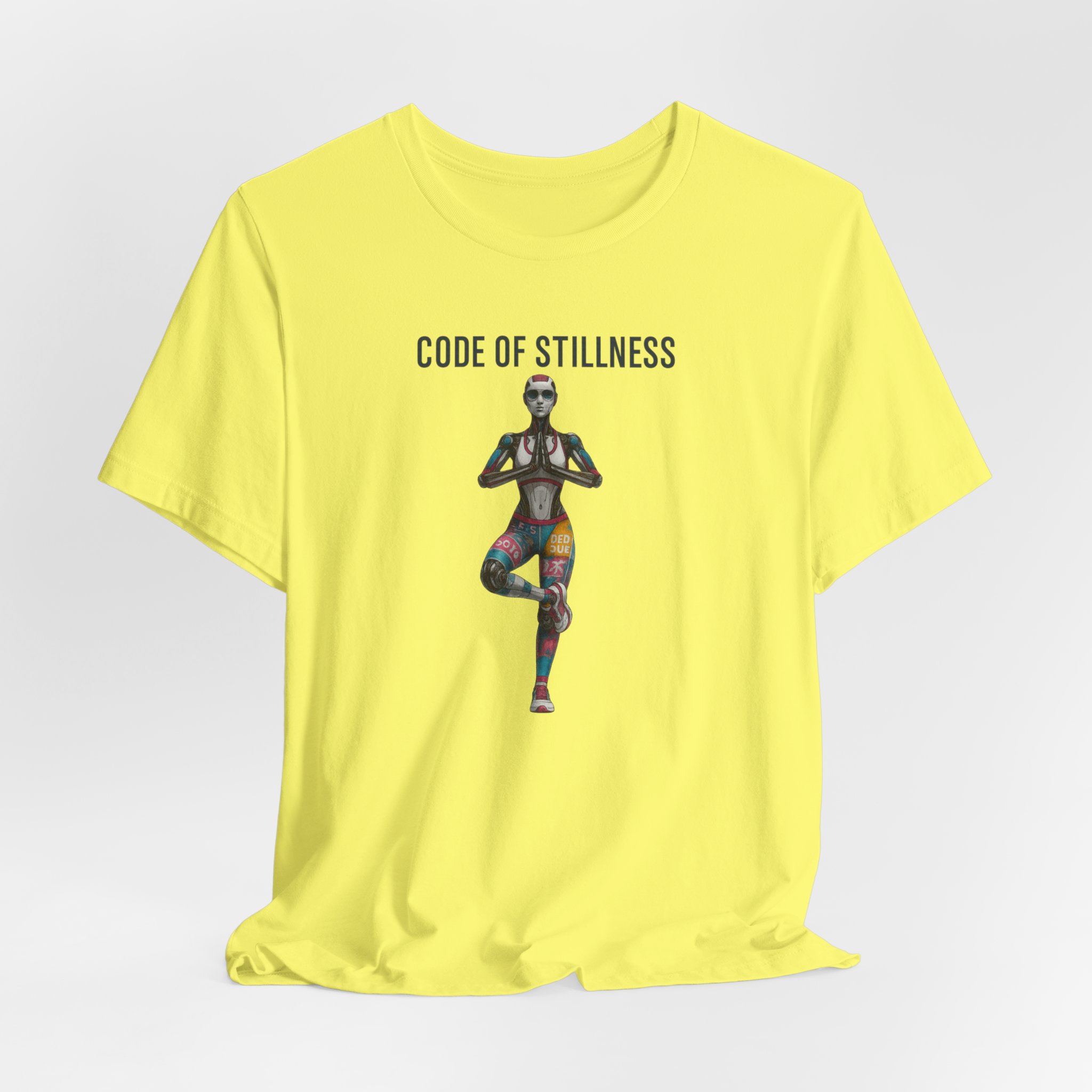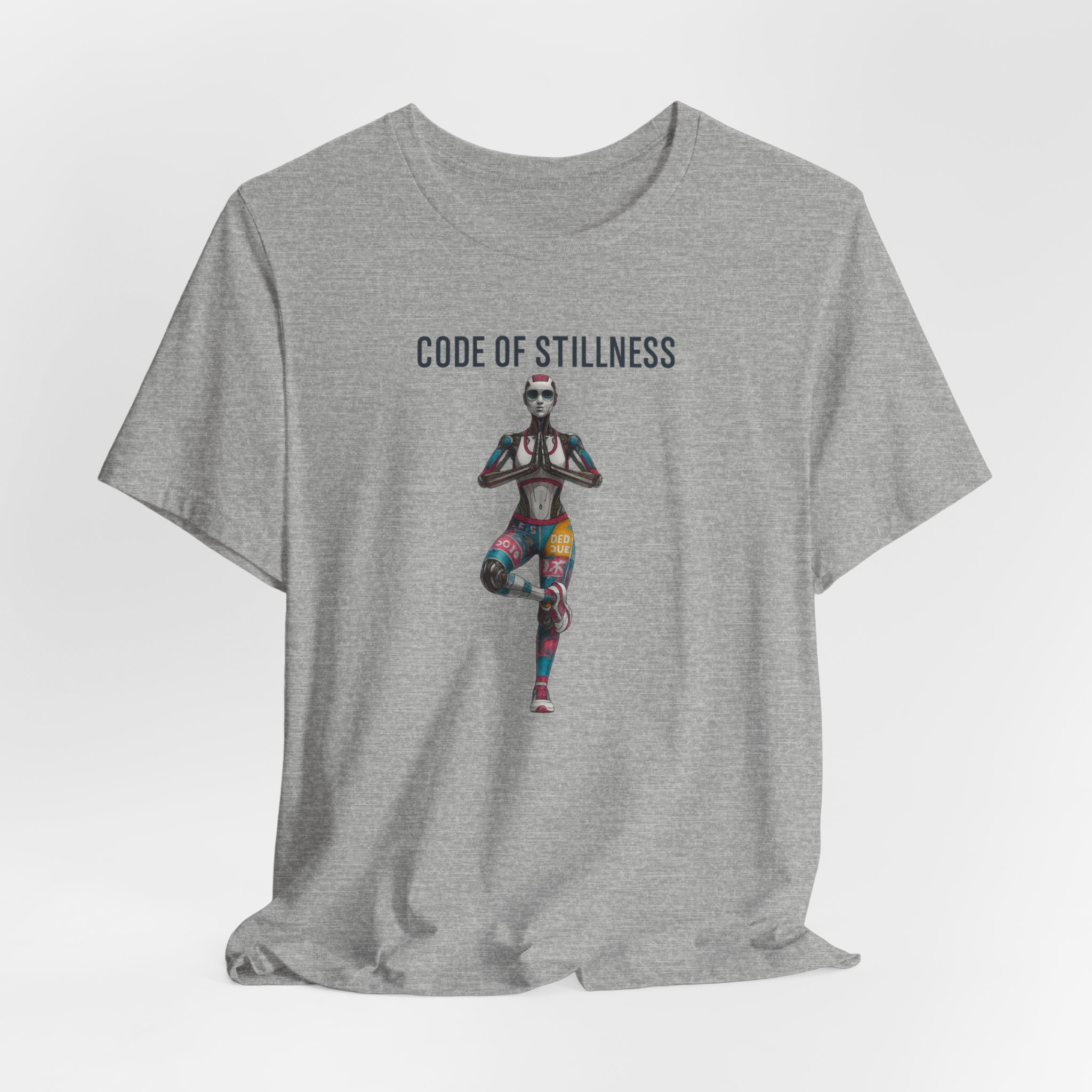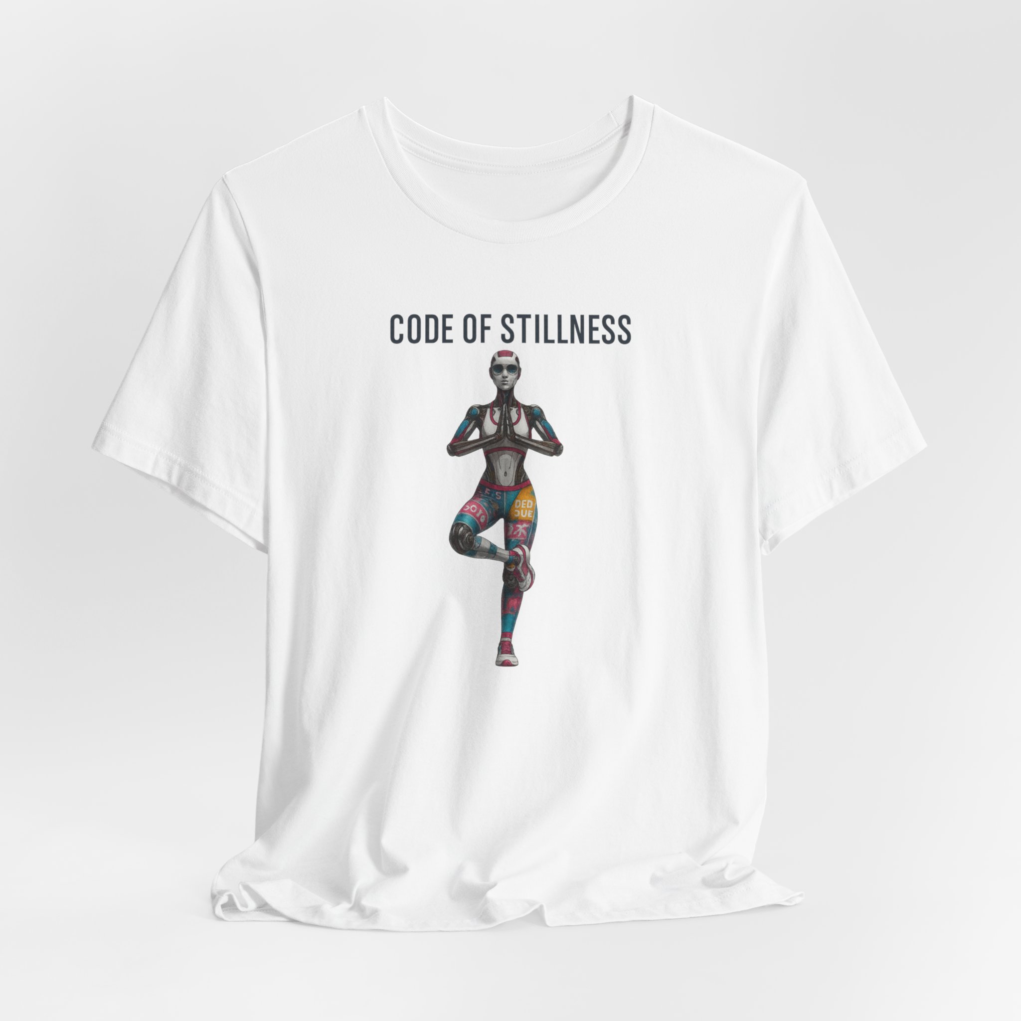 Futuristic female humanoid AI robot in a yoga pose with the text ‘Code Of Stillness’. This unique and modern T-Shirt design exudes a sense of technology and mindfulness, making it perfect for tech-savvy individuals who are also into yoga and meditaton. Ideal for wearing during yoga sessions, casual outings, or tech-themed events.